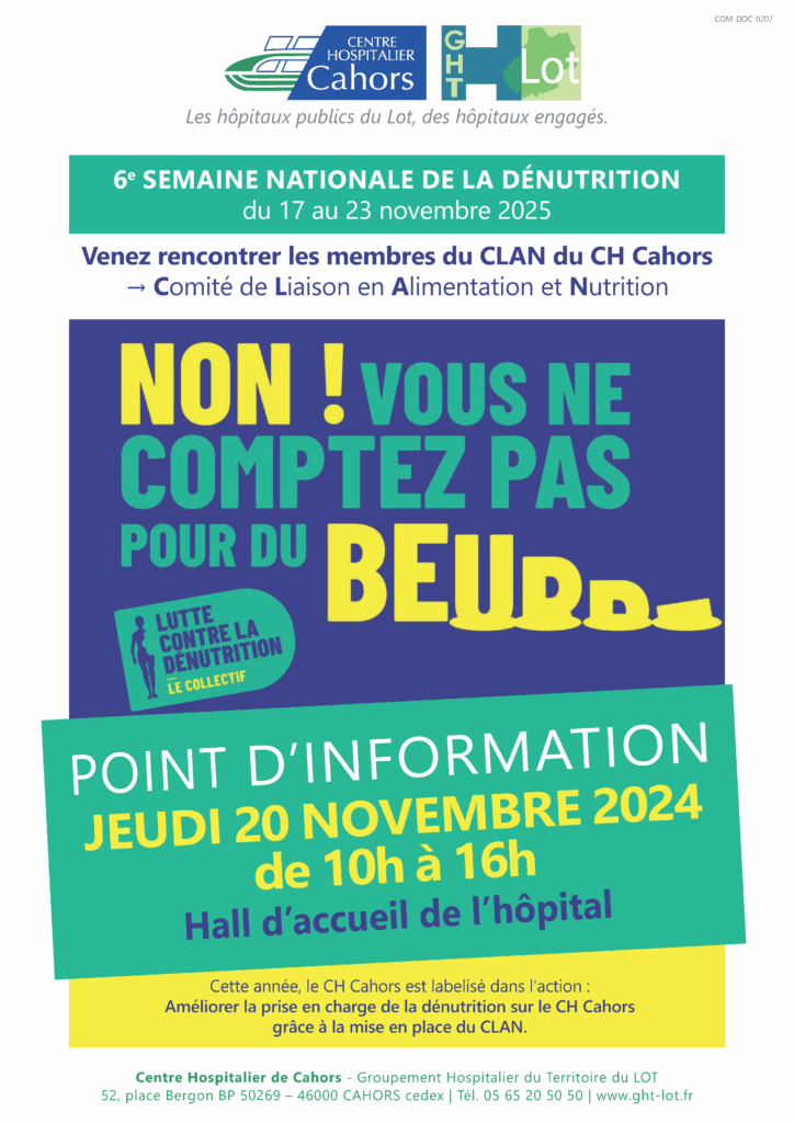 💬 En ce lundi, nous entamons la 6e Semaine Nationale de la Dénutrition. Dans ce cadre, le CLAN* du Centre Hospitalier de Cahors organise un point d’information et de sensibilisation : 📅 ce jeudi 20 novembre ⏰ de 10h à 16h 📍 dans le hall d’accueil de l’hôpital. La dénutrition est l’un des enjeux majeurs […]