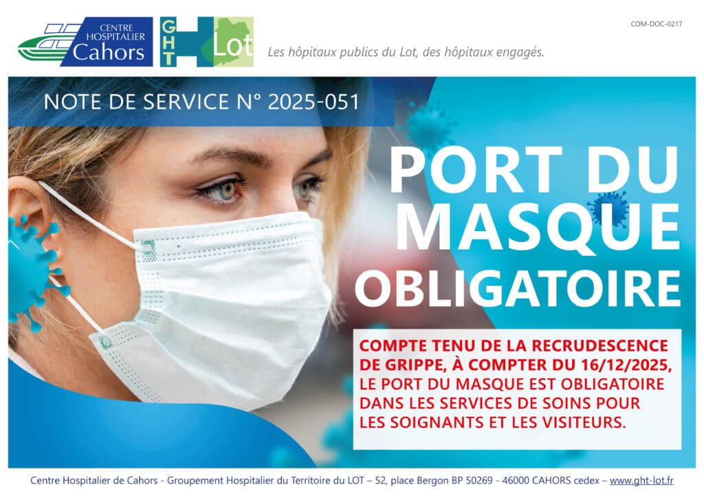 Compte tenu de la recrudescence de cas de grippe, à compter du 16 décembre 2025, le port du masque devient obligatoire dans les services de soins pour les soignants et les visiteurs.